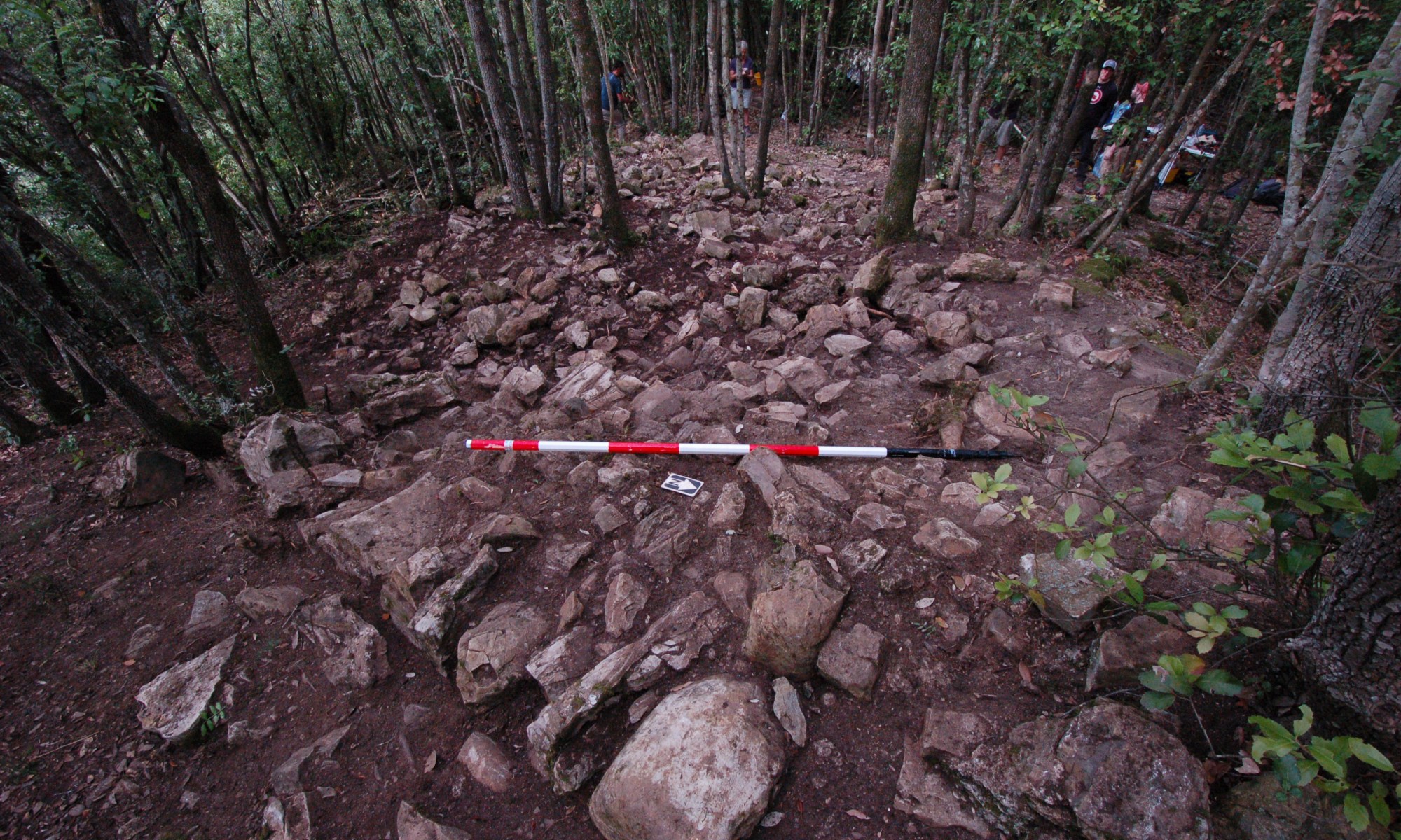 This morning at Castellaraccio, after a brief lesson on the use of the dumpy level, all the team focused on the removal of the final collapse (2) of the structure in Area 1. In doing so, we exposed the eastern part of a new wall (5) which was partially covered by the rubble. The wall alignment is E-W and it is probably dividing the area into two or more rooms.
