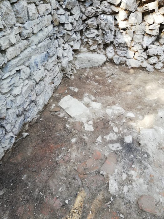 This Wednesday, we had an exciting day at Castellaraccio. After two weeks of picking away at wall collapse, we were finally able to begin exposing our new context layer of roof collapse. This layer is characterized by dense, dark soil with few rocks and many tiles. Minutes into the day, we decided to take out the metal detector and try our luck. It quickly directed us to a patch in the left corner of the palace (area 1000), and sure enough, we found another beautiful silver coin! This invigorated our spirits and fueled us with the energy we needed to face another long day of work. Additionally, we were lucky enough to be joined by three eager children- Alessandro, Paolo Alberto, and Carolina. While Lilli, Grant, Megan, and big Alessandro dutifully worked away at exposing our new context layer, Madeline supervised the children and involved them in numerous activities. The children learned to use the metal detector, sift through spoil, shovel, trowel, and expose walls. They were enthusiastic, optimistic, and quick learners. By the end of the day, they expertly uncovered a large portion of wall at the house (area 2000). Amidst the energy of our newest archeologists, Marc remained cool and steady in his trash midden (area 3000) just outside of the house, where he uncovered a new context layer and found more bone and pottery fragments. The team back at the palace continued to expose the layer of roof collapse throughout the day in addition to using the total station to take depth measurements of the new context layer. While no more silver coins were found, we did found several bone and pottery fragments.