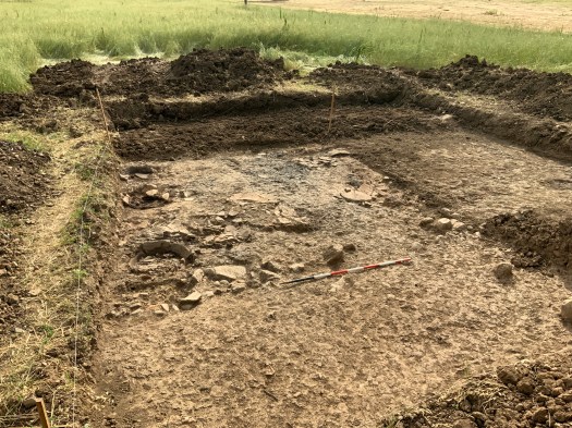 The excavation at Podere Cannicci was in full swing this Wednesday, with the team continuing to remove contextual layer 36 in order to further examine Rooms I and V. One set of archaeologists was focused on Room I and articulated a series of pebbles that align with one of the room’s walls. Whilst articulating these rocks, Alyssa uncovered a bronze hairpin; other finds uncovered by this group include pottery, bones, and slag. Another team focused on Room V and worked on further exposing the southern wall. Here, Michael found a fragment of stamped black gloss pottery. In Area 1000, the excavators continued to trowel Context 1 in order to uncover Context 2, and Thuraya discovered a bronze revetment.