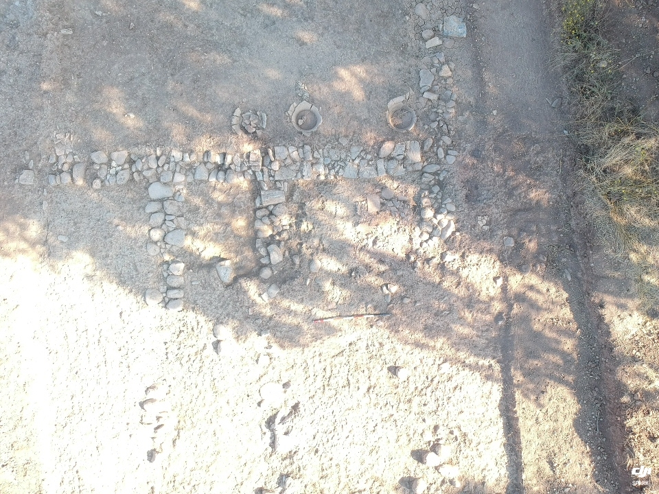The removal of the collapse covering US 21 (the wall dividing the room with dolia from the recently newly exposed spaces of the complex) revealed a burnt context, red in color and with a high concentration of charcoals. Moreover, a small rectangular structure, made up of mud bricks , was discovered, most likely a furnace or a kiln. In this room, a handle of a situla was collected.