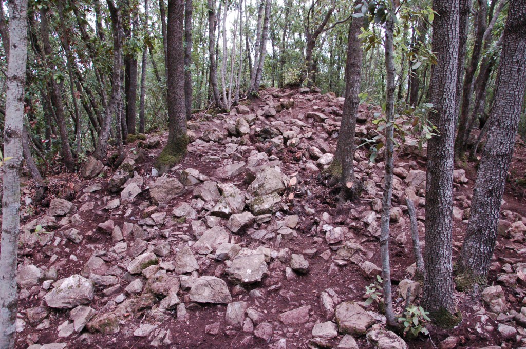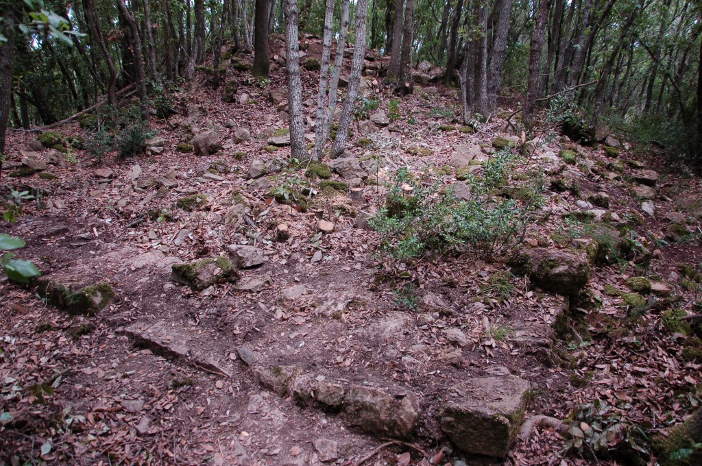 Castellaraccio di Monteverdi lies on a hilltop at 130 meters above the sea level. Nowadays it appears as a deserted medieval village, with few structures still visible in the vegetation. It faces the Ombrone river and overlooks the ruined Medieval bridge connecting the NW shore to Sasso d’Ombrone.